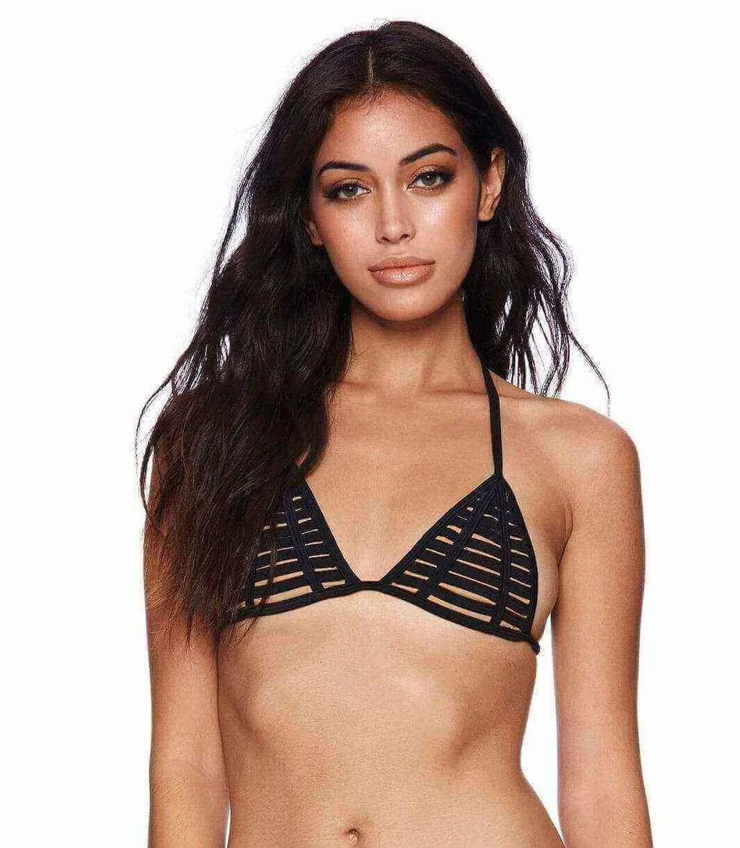 - Fixed triangle top with rows of binding and nude lining to give the illusion of skin.
