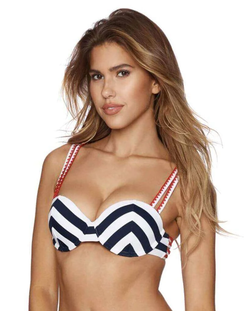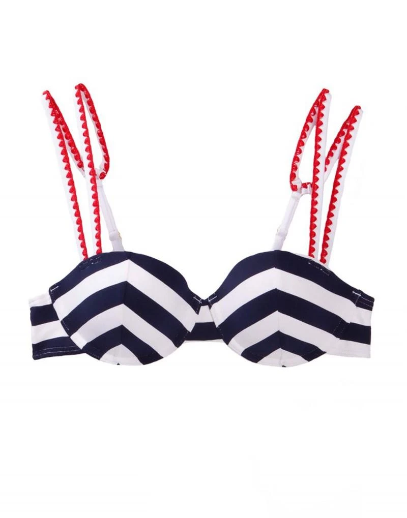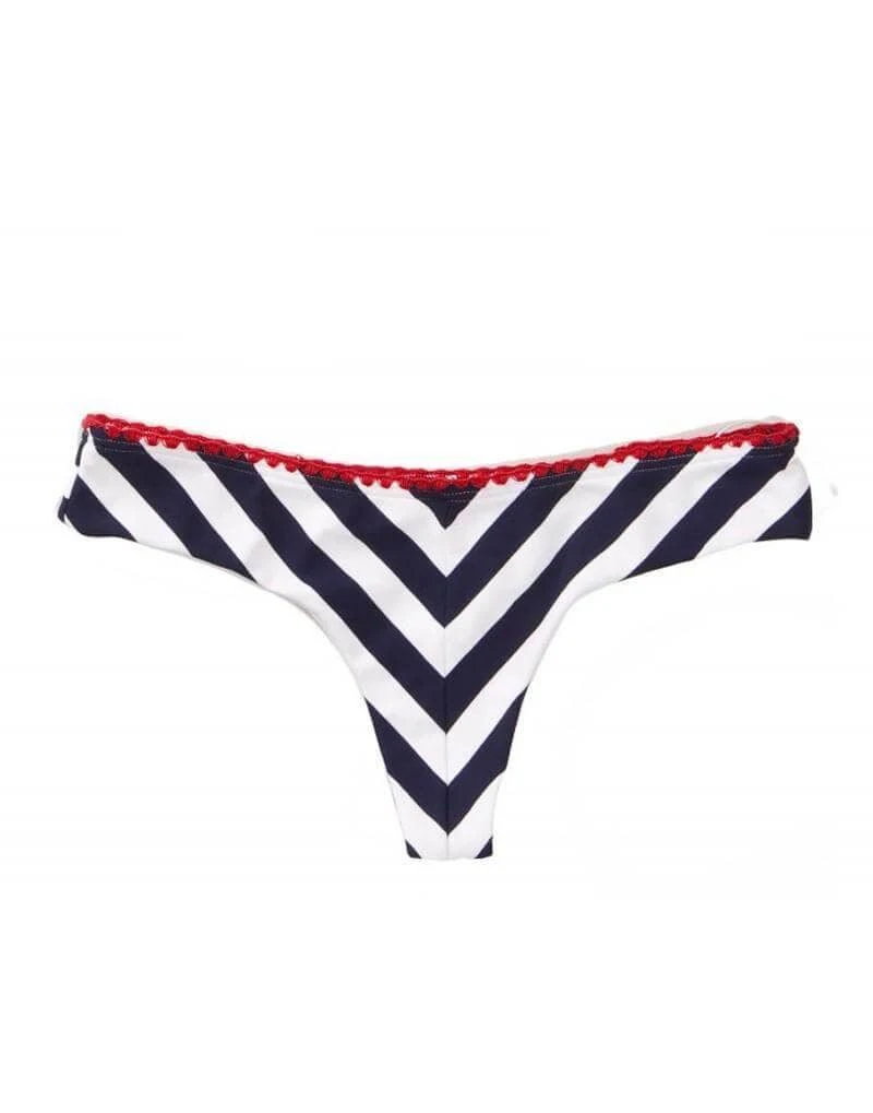 Great fun nautical piece is perfect for the beach or resort. The balconette top features molded cups and underwire to ensure a wonderful fit. The shoulder straps on the top feature scalloped lace detailing and the straps are fully adjustable. The top also have a three hook back adjustment. The tanga bottom is very cheeky for those who like a minimal look. This set will leave you looking sexy and classy all together!!