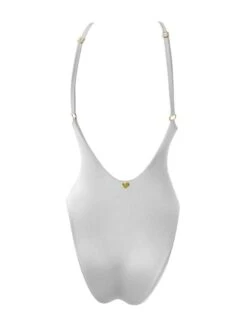 You will look like you are in absolute luxury with this gorgeous swimsuit. This beautiful swimwear example features a deep plunge front accented with gold beading. The string ties are finished with a gold embellishment at the ends to complete this rich look. The top features removable padding and ties around the neck and back to ensure a proper fit. The bottom also features cheeky scrunch rear coverage and adjustable sides ties. This bathing suit is fully lined. This is the perfect bathing suit for a pool party, the beach, and a vacation day at the resort.